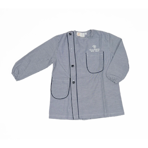 Bata de tecido xadrez em azul e branco com botões e com bordado do logotipo do Colégio Helen Keller no peito.