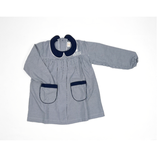 Bata de tecido xadrez em azul e branco com botões e com bordado do logotipo do Colégio Helen Keller no peito.