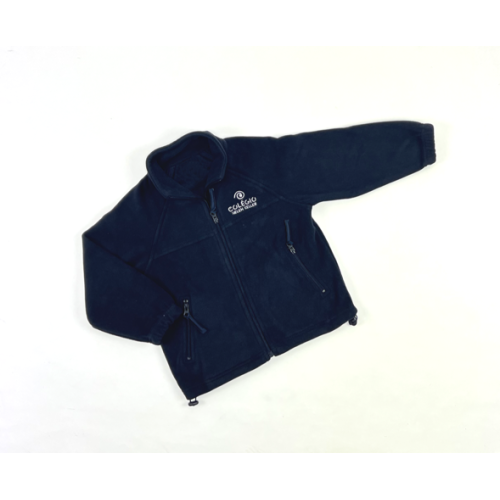 Casaco azul escuro em malha polar com fecho; elástico nos punhos; com bolsos laterais; pequeno bordado do logotipo do Colégio Helen Keller no peito.